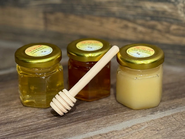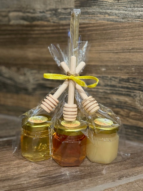 Are you looking for that perfect gift idea for friends, family, teachers, or neighbors? Our Mini Honey Trio makes the perfect gift for any occasion. Treat yourself or someone special with this convenient gift pack. Each set gives you the chance to sample all three varieties of our 100% raw honey (spring harvest, fall harvest, and the incredibly delicious creamed honey) plus three honey sticks. It's the perfect way to sweeten your day!